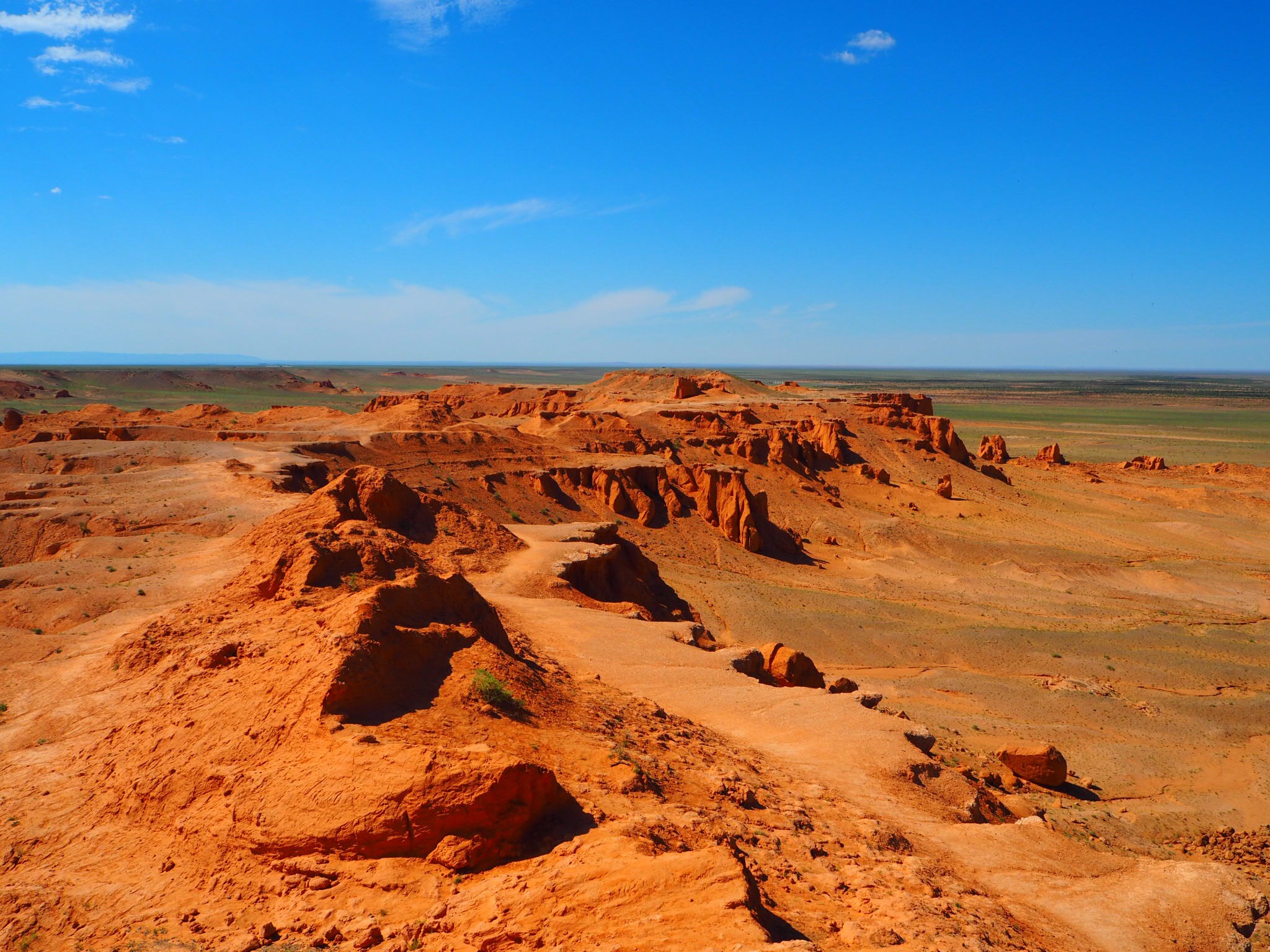 Our original plan was to stay in Khongoryn Els for two days, but the extreme heat of the previous day coupled with the fact that there’s really not much to do there except for hike in the dunes, which is not very enjoyable during the day, led us to change our plans. After a difficult conversation with Bagii we eventually conveyed that we’d like to just move on to the next destination, so we packed up and hit the road again. We spent the afternoon at Bayanzag, hiking around the “Flaming Cliffs”. We were again impressed by the lack of controls in Mongolia, there’s really not much that you’re forbidden from doing. Likewise, even in an important tourist destination such as this, there were no fences or walls, and not much infrastructure to speak of; you are free to simply hike where you’d like at your own risk.