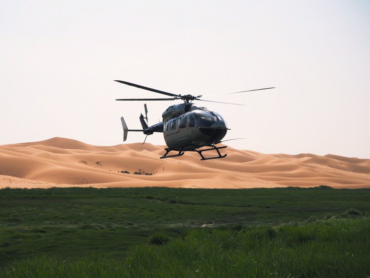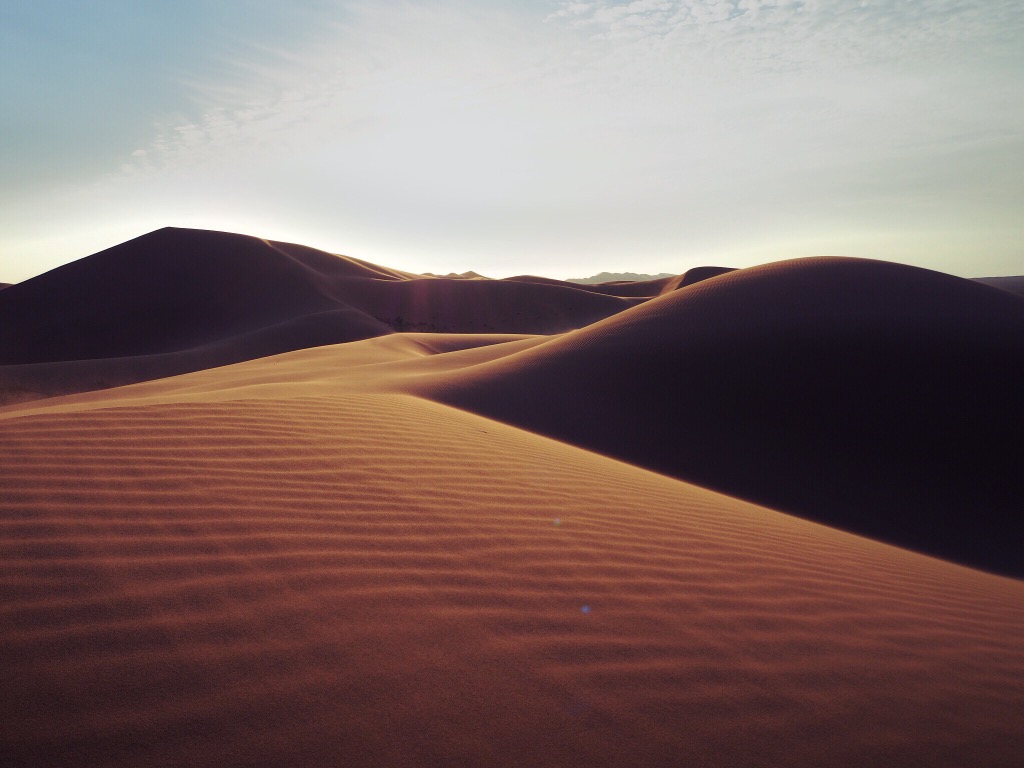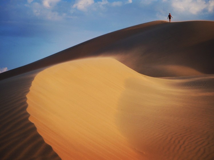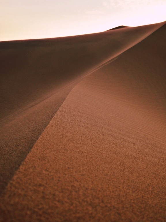 Suddenly, a professional-looking crew of who appeared to be Koreans showed up with recording equipment. They were prepared for the task at hand, and were covered from head to toe, including gloves and masks. In the back of our minds, a question lingered about whether these were run-of-the-mill yet very well-prepared tourists, or some kind of actual media crew. Our curiosity was satisfied when a huge luxury helicopter swooped in from over the sand dune. It landed briefly and exchanged some sort of equipment or information with the crew, and abruptly took off again. We eventually learned that they were filming for some Korean reality TV show, they spent the rest of the day getting shots of camels and sand dunes and flying camera drones overhead. Their operation settled down a bit as the sun was going down, and they were confined to a makeshift studio behind one of the dunes. About an hour before sunset we set off towards the top of the dune ridge. We spent the next few hours frolicking in the cool sand, running down steep dune faces or jumping off edges or falling ungracefully in the deep sand.