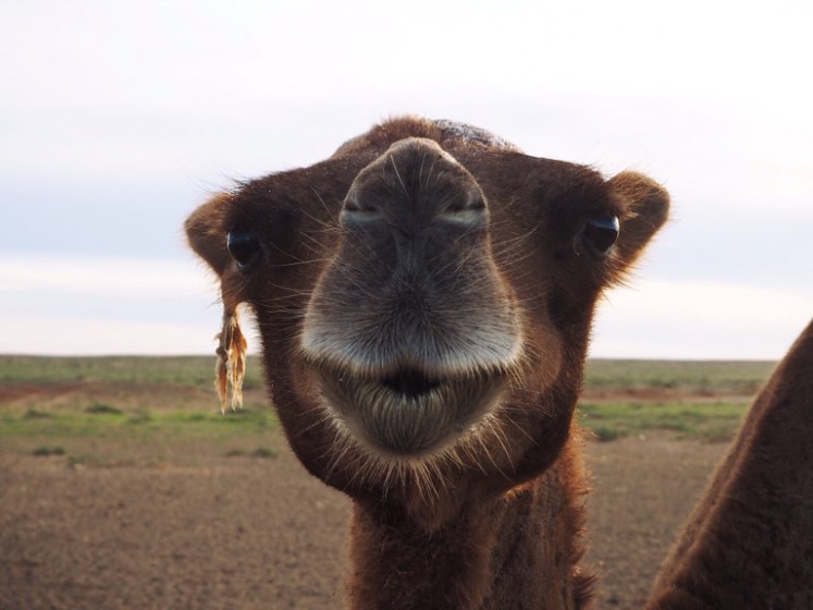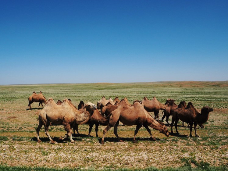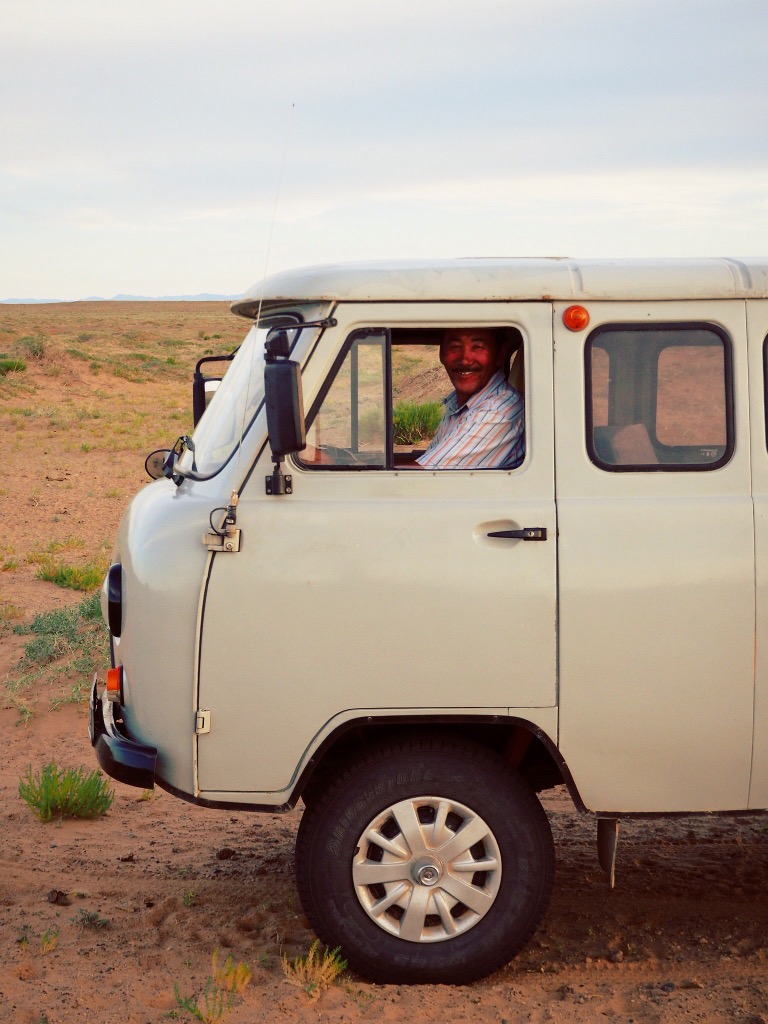 Our trip began with our introduction to Bagii, the driver we had hired to take us around the Gobi desert for a week. He came by the guest house in the morning to pick us up and his few-toothed grin and enthusiastic hand-shaking suggested that we’d have a fine time with him, despite the fact that he knew only a few words of English. Considering he was practically our only companionship for the next week, this is actually pretty important. We loaded our bags up into his vintage Soviet UAZ-452 and bumped our way out of Ulaanbaatar. The UAZ-452 is a specimen of extreme endurance, crafted with the utmost attention to structural integrity and redundancy, complete with four wheel drive and two gas tanks. If anything was going to get us through the Gobi, it was this. The first several hours outside of UB were pretty uneventful, following the main (paved) highway south. At the northern edge of the desert we were greeted by a few dozen camels grazing by the side of the road. It’s worth mentioning that these (Bactrian) camels are the two-humped variety, native to Central Asia. The dromedary, using the infrequently-used but technically correct nomenclature, is the single-humped variety occupying the Middle East and North Africa. This was the first time we had seen true Bactrian camels in person, so we yelled for Bagii to stop to take some pictures. It wasn’t long later, near Tsogt-Ovoo, that we split off the main highway onto an unassuming dirt road to begin our trip in earnest.