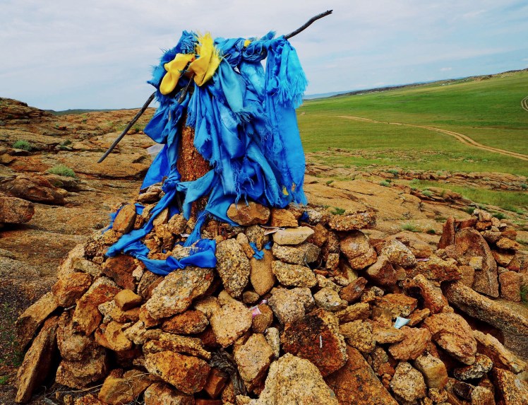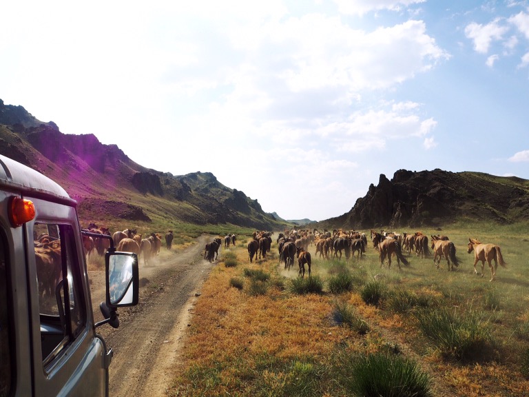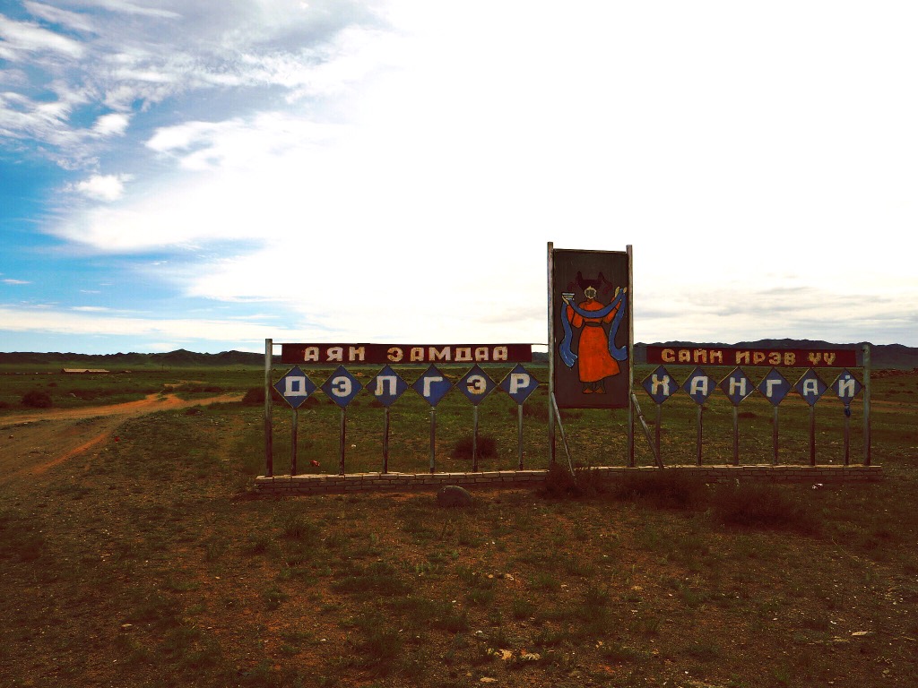 Some 90% of the possible paths of travel in all of Mongolia are on little more than faint tire marks across the vast stretches of land. Much of our travel was done on tracks like these; a crosshatch of long, and very straight tire tracks extend for as far as the eye can see. Bagii would cling to a track, then switch to a perpendicular track, then switch to another, all the while pointing to his head and exclaiming “GPS!” What is more, the land out here can be completely devoid of any geographical marking with no indication of which track is which. Breaking up the monotony were breathtakingly beautiful mountain ranges, colorful rock formations, or the strangest imaginable desert outposts of a hundred or so inhabitants. These outposts were few and far between, and most consisted of a handful of brick-and-mortar shops or administrative buildings surrounded by fenced in yurts with broken down cars in the yards. The telltale sign of these towns is the solitary cell tower, visible from far away in the even terrain. Out from these towns grows a spider’s web of tire tracks in the dirt, it is anyone’s guess where one would lead, but a town is certainly considered major if it has even a single paved road leading to it. The straight roads across the flat terrain were the most manageable, we’d top out at about 60km/h on these ones. The more difficult paths were up and over the mountain ranges, or down through once-flooded (and now bone dry) gullies. These range from being stable enough to almost drink from a bottle of water to being thrown against the inside of the van. Needless to say, we grew accustomed to the different grades such that pulling back onto the paved road on the last day was something like slipping into silk sheets on a water bed.
