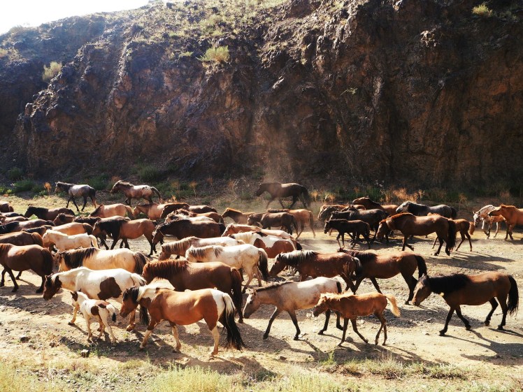 We headed back down the valley to see if the horses were anywhere to be found. We did indeed see two horses tied up and saddled. It was my first time riding in many, many years, but Oona is an experienced rider of more than a decade. The ride itself was awfully boring, with the horse guy (for lack of a better term) refusing to let us ride any faster than a walk. We couldn’t deduce why, but figured it had something to do with the fact that we were all roped together. After a quick up-and-back of a few kilometers, we managed to convince him to take Oona for a gallop. They rode off like the wind and were out of sight within a few minutes. I hung around the van while Bagii was cleaning and polishing it, as usual. After 10 or so minutes I spotted a cloud of dust on the horizon and Oona rode triumphantly back to the yurts.