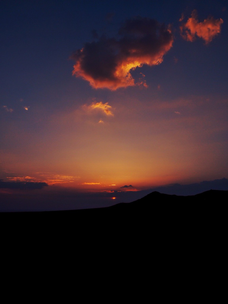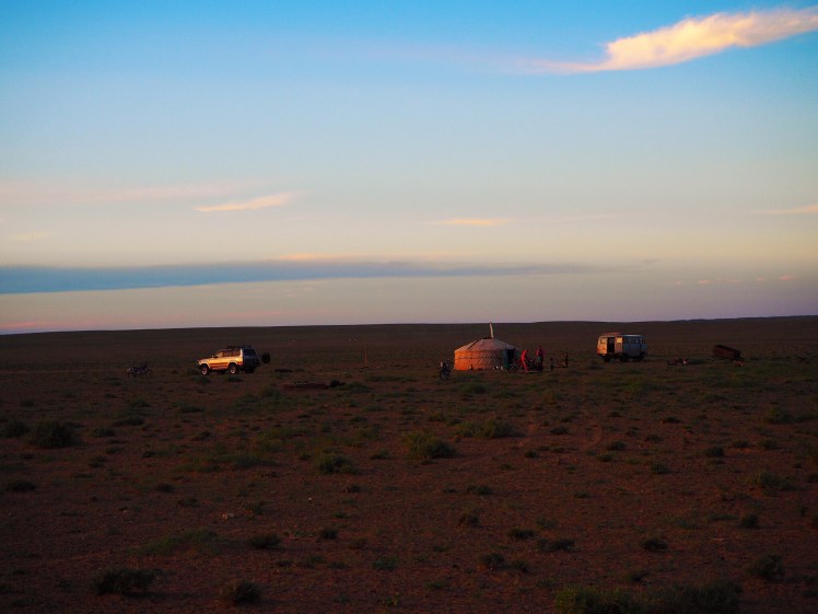 After a few dozen more kilometers along the road we came to a well where a shepherd was watering his goats. Next to the well was a splayed out 4×4 tire, stretched to become a makeshift trough. The shepherd would hoist buckets from the well and fill the trough while his goats would drink their fill and move along. Shortly after, Bagii’s signature “sleep?”, accompanied by the universal hand signal for sleep (laying one’s head against one’s hands) indicated that we could pull off wherever and set up the tent. We hiked a short distance to the top of a nearby hill as the sun was setting, the cloudless sky suggested that we go without the rainfly. This was a good decision; as the sky darkened we saw the Milky Way in unparalleled clarity while the cool desert wind kept us comfortable.