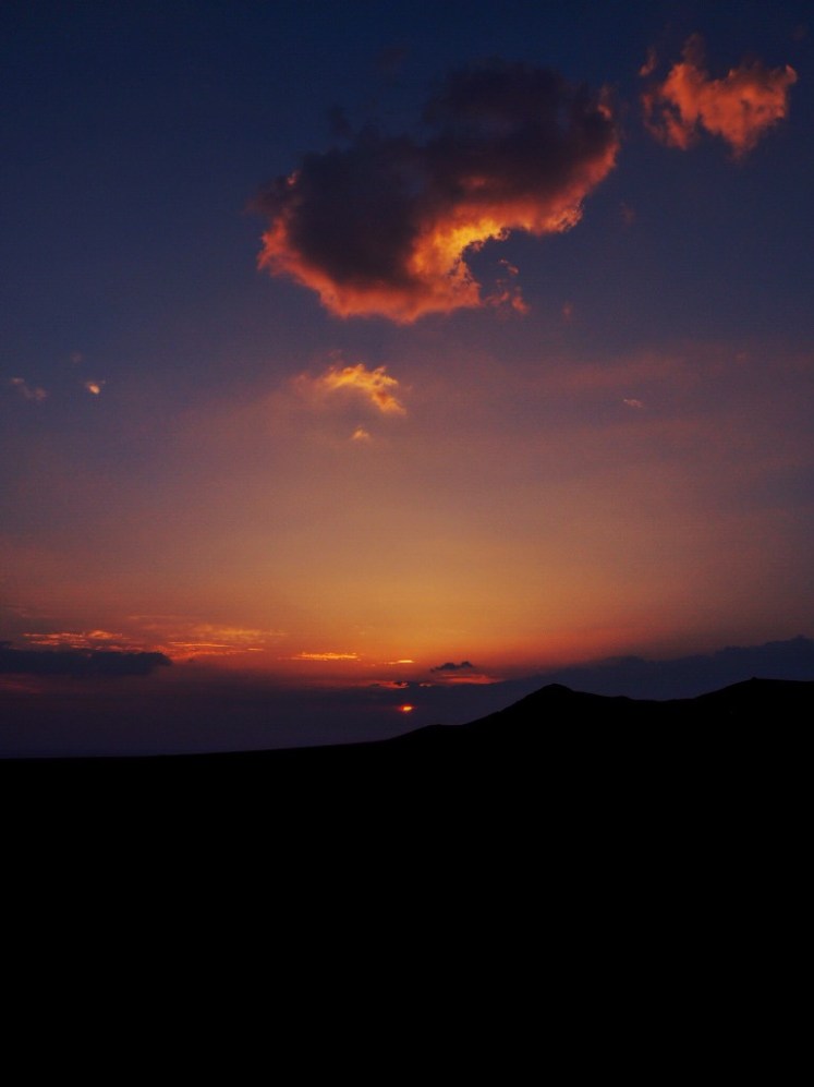Our way out of the mountains was through a narrow and curving passageway in the rocks. There was a huge pack of semi-domesticated horses kicking up a dust storm leading the way. We managed to pass all several hundred of them on a wider portion of the canyon, and eventually found a place to camp as the canyon opened up to a vast, high elevation plain. Again, seeking a bit of privacy, we found a tent site up the hill a ways from the parked van, and watched the horses from up the canyon make their way into the opening. The stars were beautiful again, but our attention was focused on the various headlights miles off in the distance –speculating about their ultimate destinations– until we drifted to sleep.