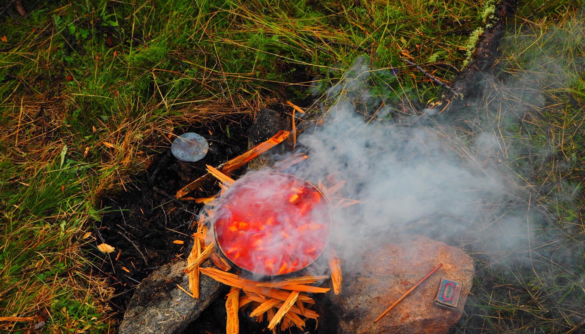 We took off in a hurry and made it to our camp not long later. At this point, the rain had finally subsided and the sun even came out a bit. We hurriedly unpacked our gear, set up the tent, and lit a fire. Everything was soaked. Our softshell coats were no match for the onslaught and had given up repelling the water long ago. Our backpack and sleeping bags bore the brunt of it, and we spread them out in the dwindling sunlight in hopes of drying them out before sleep. Shavaa crafted a massive fire which definitely helped to dry our shoes, jackets, and souls out though. We retired to still damp sleeping bags in hopes of better weather the next day.