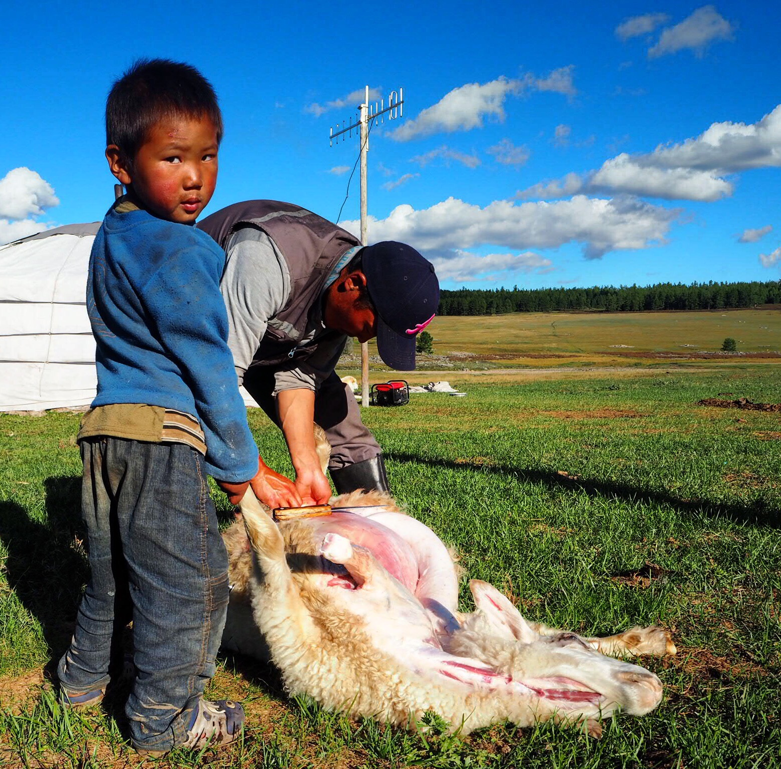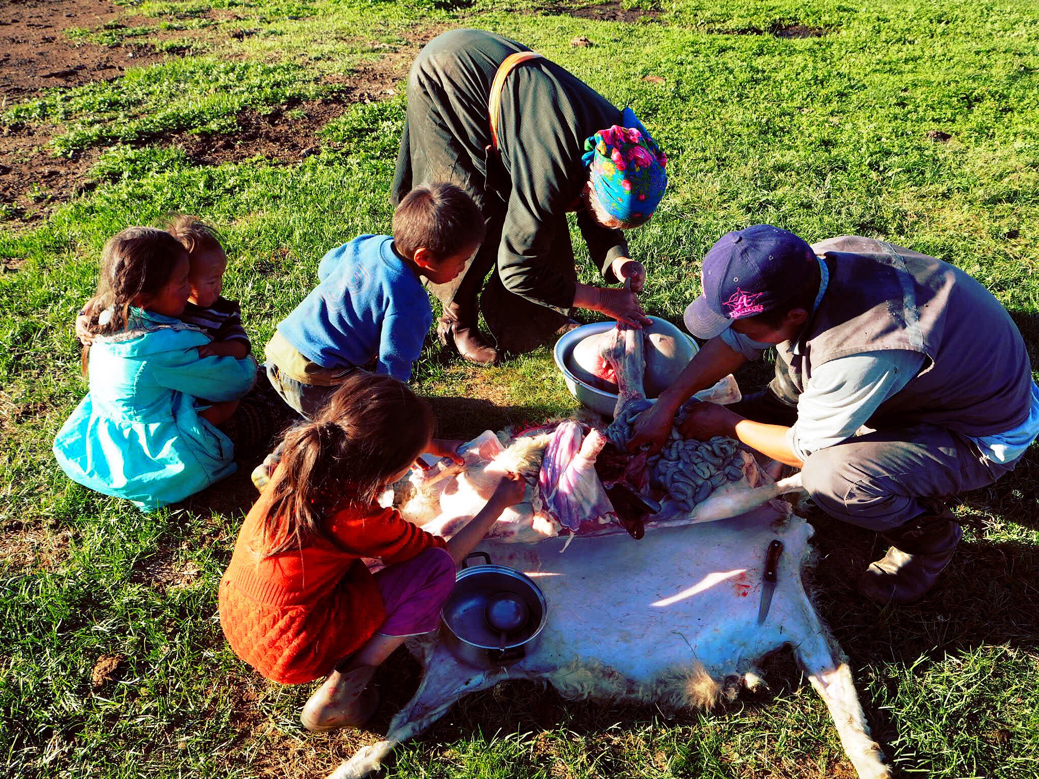 After an elaborate sheep wrangling ceremony, the rules of which we couldn’t really determine (as usual), Shavaa prepared for the slaughter. With the sheep turned on its back, he drove a freshly-sharpened knife directly into its stomach and reached his arm, elbow-deep, into the still-living sheep and grasped ahold of something vital until it stopped moving. The operation, while macabre and slightly horrifying to us, was carried out with the utmost in respect and precision. During its last throes, the sheep lay silent and Shavaa had a strong yet soothing grip over its neck, and he muttered comforting words as it died. Once its last breath was gone, he skinned and gutted it with unbelievable care. The carcass hung on the wall of the yurt while the innards and blood were boiled into a revolting stew, which the Mongols seemed pretty wild about. We managed to dodge participation in the innard stew feast because of the time. We were quite tired after the day’s ride, and the stew wouldn’t be ready until midnight, so we insisted on retiring to our tent, to the dismay of Shavaa. We made a not-particularly-impressive concoction of pasta and sauce on the fire by our tent, but we were quite glad to not be slurping up pancreas and intestine and who-knows-what other organ back in the yurt after hours of waiting.