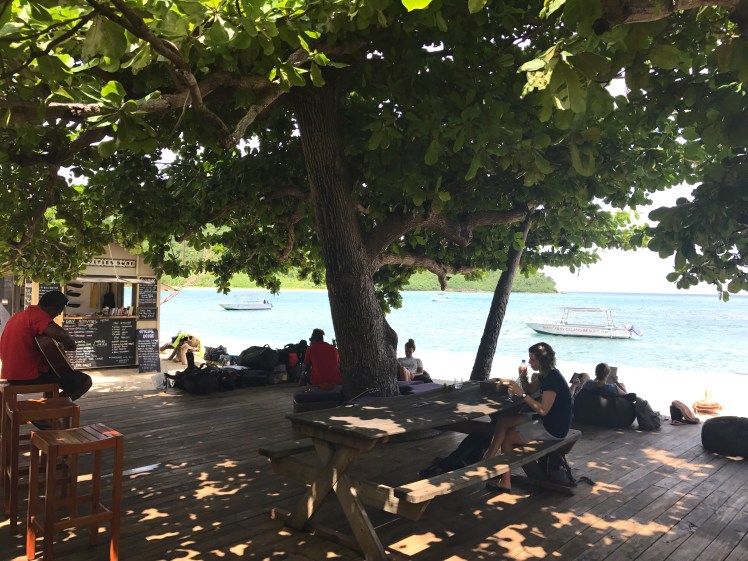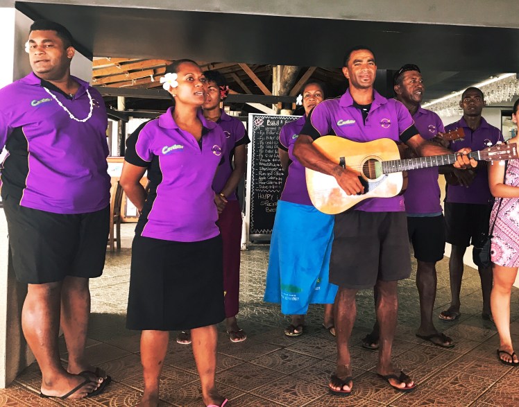 The seabus parked off the coast of Tavewa, and speedboats from several different hotels in the area (most islands in the Yasawas have some sort of hotel on them) zoomed to and fro, picking up people and supplies from the arriving boat. We were shuttled to the shore in a small, open topped vessel, and greeted by the hotel staff singing and playing Fijian songs on a guitar and ukelele.