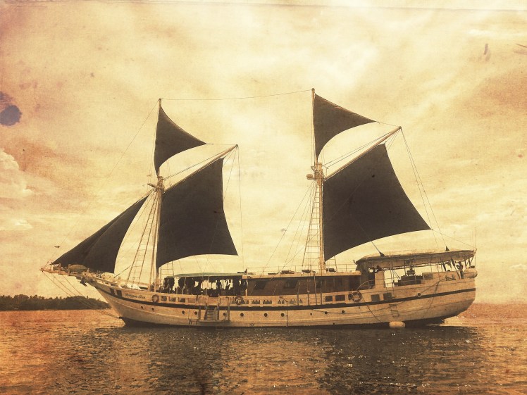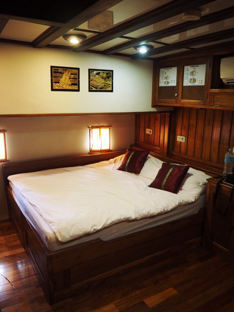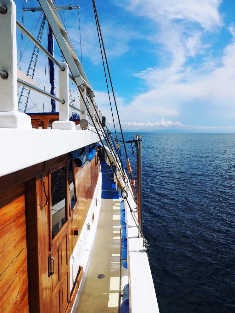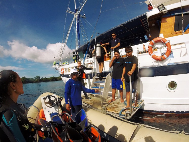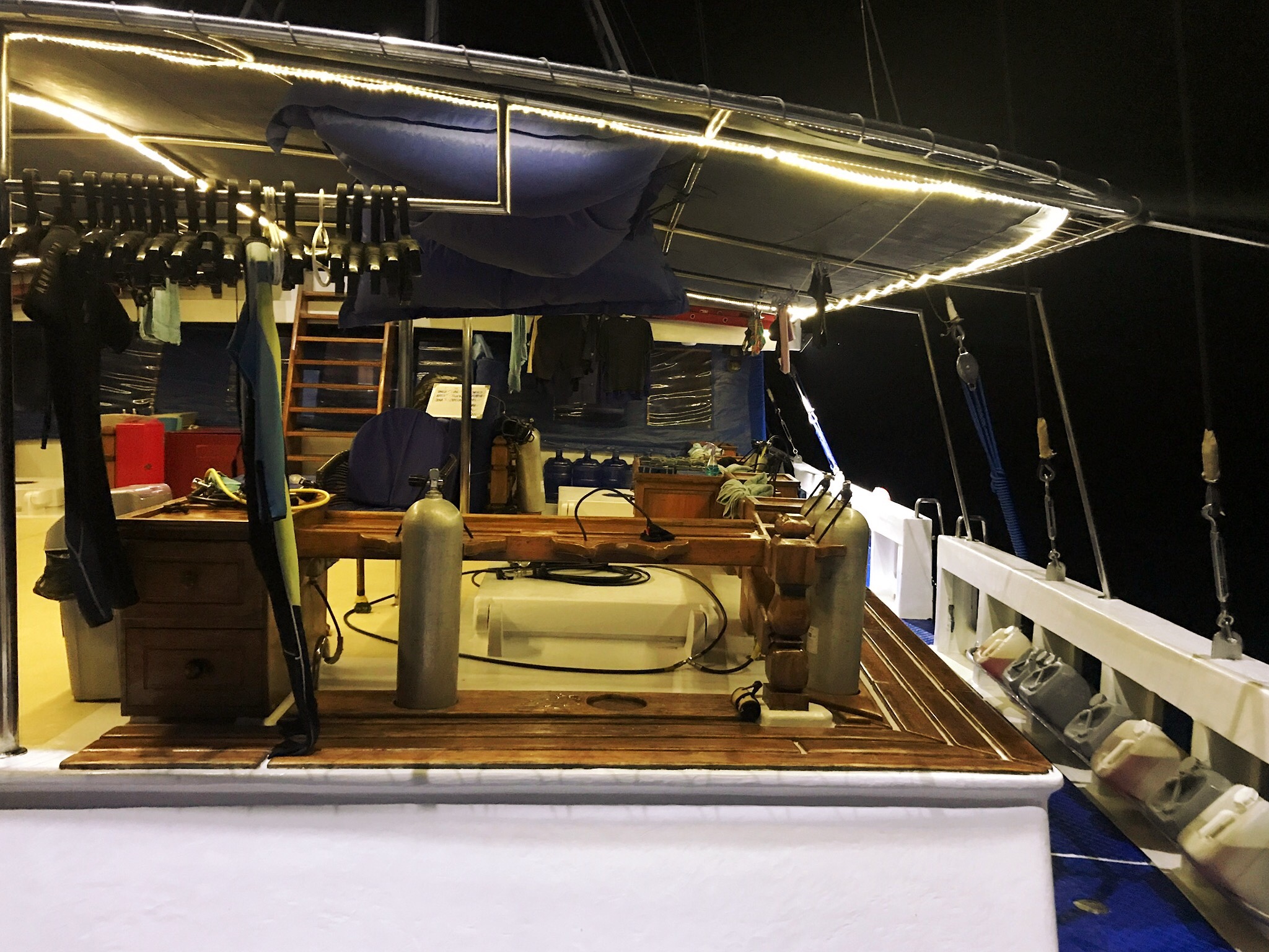 Our first day aboard there was no diving, it was simply a matter of getting acquainted with the ship, the crew, and everything else we’d be calling home for the next week. Our cabin was lovely, a double bed in the corner with some port holes next to it just above the waterline, and an ensuite bathroom. The boat is massive, measuring 40 meters from stern to bow, and it’s technically a sailboat, although we’re told they only use the sails for photoshoots, as it apparently makes more sense to motor to the destinations it serves. Every meal is cooked on site by the full time kitchen team, and the local beer in the common fridge is unlimited and free (!).