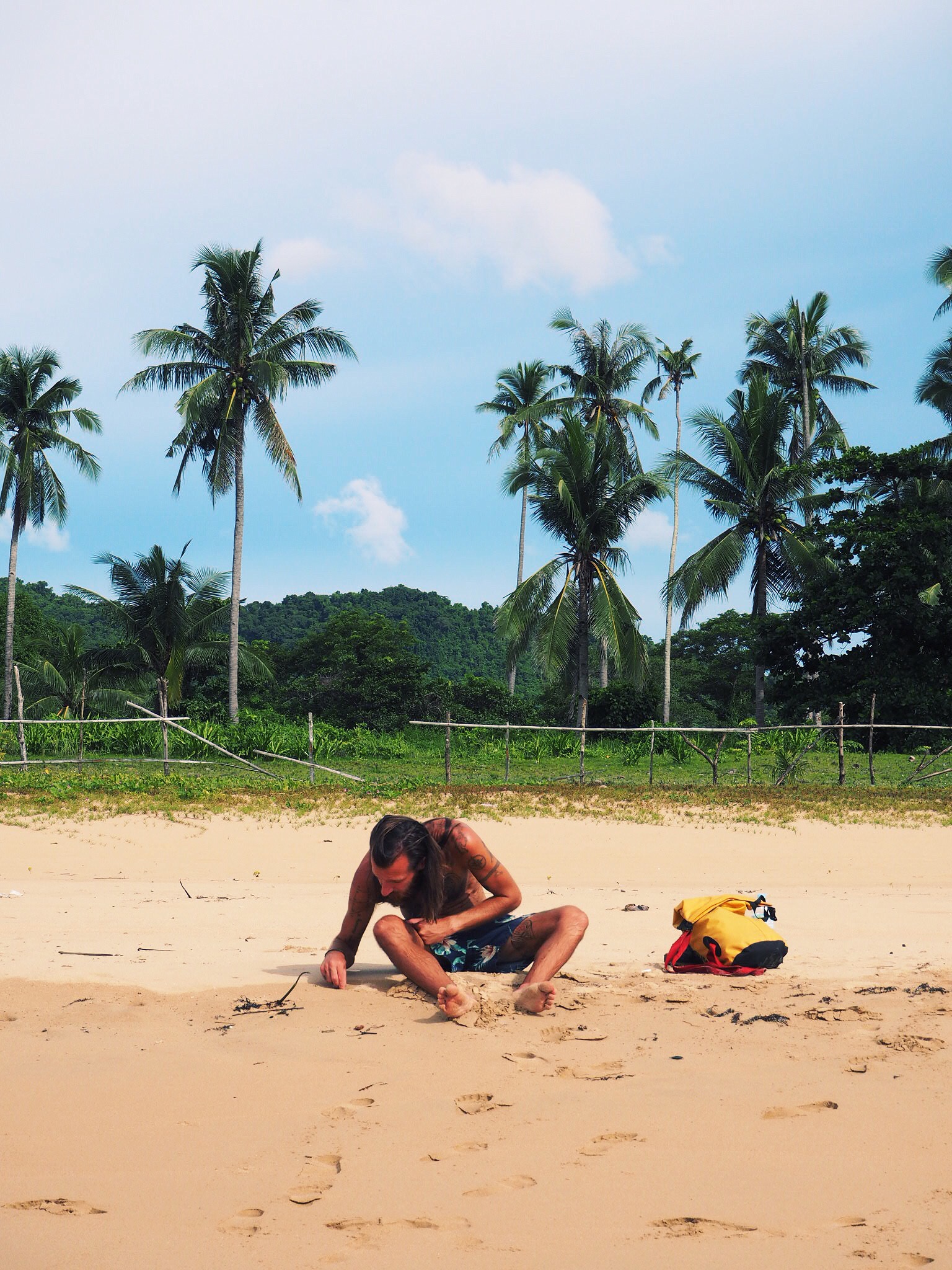 In between the patches of rain we would try to get out and explore a bit, and indeed did manage to on a couple of the clearer days. On one such day we headed out to Duli Beach, some distance north of El Nido. Fortunately the skies remained clearish for most of the day and we were able to enjoy our time on the nearly entirely empty beach. The trip out there was quite nice as well, as we wound our way through the Philippine countryside, through rice paddy and jungle and village. The last several kilometers became a bit more challenging as it was unpaved and mostly mud after the nigh uninterrupted torrent for days prior, but it wasn’t too bad considering our experiences with such things in Laos and Thailand. We had a strange encounter with a crab on the beach, which was behaving in a most un-crablike manner. The closer we got, the more it stood its ground, flexing, as it seemed, to scare of its would-be harassers. After a prolonged standoff, it scurried around looking for a hole to hide in, running into our feet several times in the process. Eventually it found a hole suitable to accommodate itself and disappeared for the remainder of our time there.