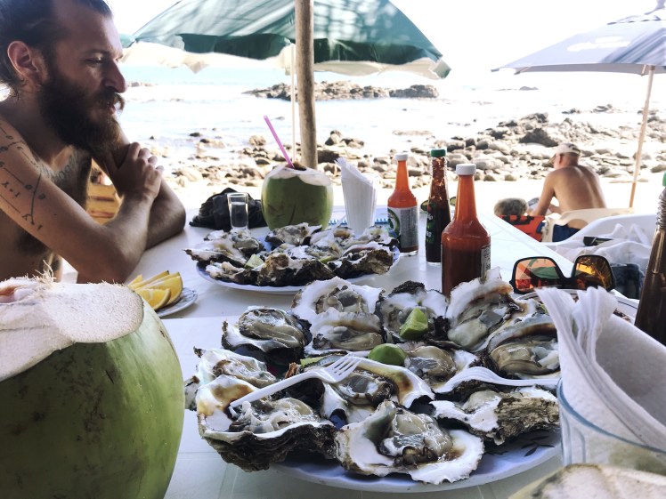 On our last full day in town, we met up with another Finnish girl, whom Oona had met through a Facebook group dedicated to traveling Finnish females –a degree of specificity at which we all had a good laugh later in the day– and her husband, originally from the area, and their young daughter. We headed down to Agua Blanca, a lovely beach some 30 minutes down the coast. We spent our time eating fresh oysters the size of our hands, drinking mezcal and fresh coconut juice, and watching the waves crash in. Shortly after arriving, we saw the familiar crash of a breaching whale some distance out from the beach. Our new friends had a drone which they assembled at a fevered pace and flew it straight out to the still-settling water. The drone was able to capture some fantastic views of a family of two adult humpbacks along with their baby, swimming south along the beach. They breached several more times, which was impressive from our viewpoint as well as the drone’s.