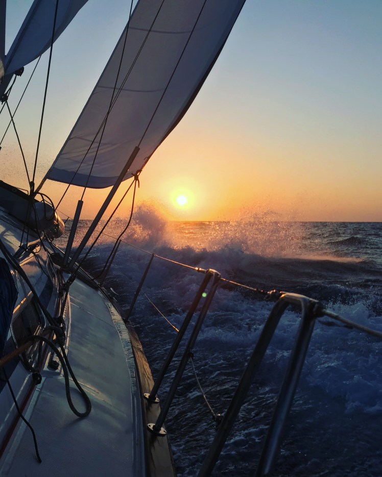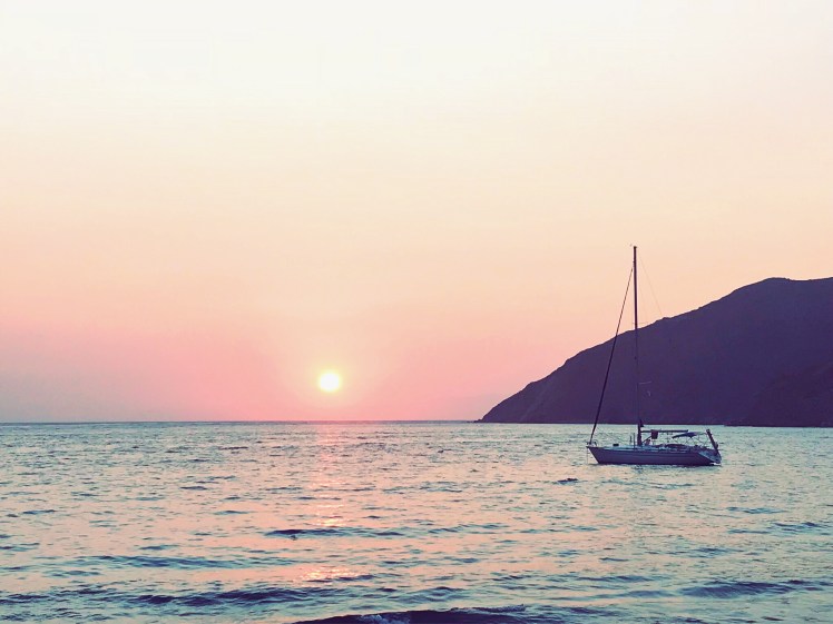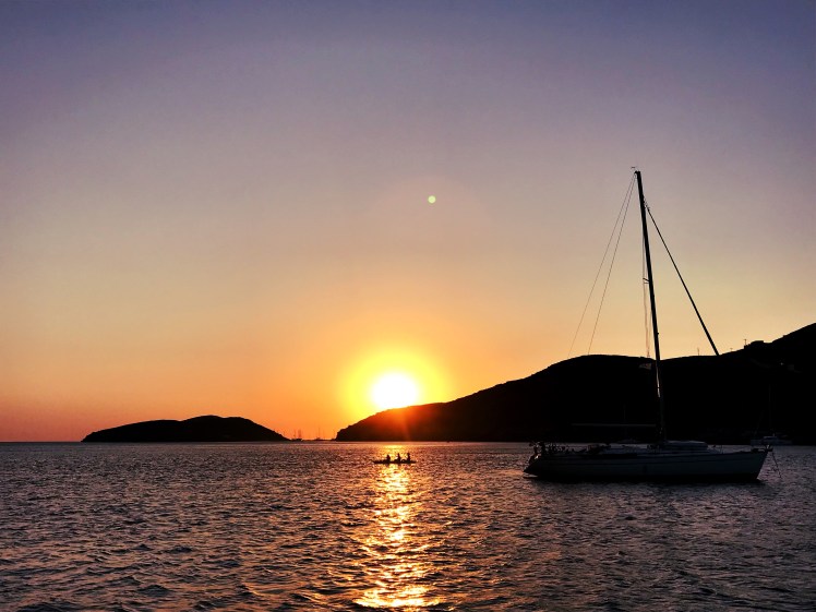 We decided to leave for Siros early the following morning, and we set sails for the island at a little after 5am, bearing east southeast for the 25 mile crossing. We were witness to a stunning sunrise, with the glowing orb ascending through the mist as we heeled through the surf at an impressive clip. The winds were strong for the whole trip, so we arrived several hours earlier than we expected, well before noon. We pulled into the bay at Poseidonia and dropped anchor. Several of us went to shore to pick up supplies while a few others stayed on board to tend to some things on the boat. With the required provisions in hand, we were all back aboard the boat by mid afternoon. We concluded that we weren’t super into the place we were anchored at, and spotted a nice looking island called Didimi off the east coast of Siros on the charts. With quite a bit of daylight left on the clock, we decided to head there, a shortish trip of about 12 miles. We arrived to a fairytale of an island, with a beautiful and secluded bay of brilliant blue water with a small collection of huts and hammocks on the sandy beach several hundred meters away. Nobody lived there, so we supposed that people from neighboring Siros used it as a weekend getaway from time to time. There was not another boat in sight, so we dropped anchor in a wonderful spot, perfectly secluded from the northern winds. We had dinner and called it a night.