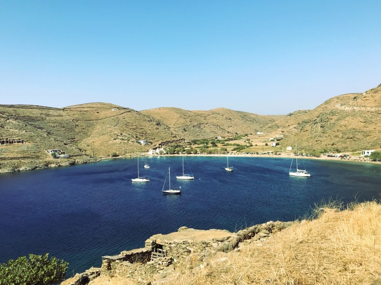 Our anchorage the next day was just on the other side of Kithnos, at the small town of Kanala. A direct sail from Apokrisi to Kanala is just about 17 nautical miles (and as the crow flies, over the center of the island, only about 8km), but our trip was quite a bit longer. The southbound sail from Apokrisi to the south end of Kithnos was rather uneventful, with a robust tailwind and sturdy swell rocking the boat, there was no need to jibe for the whole segment, and we were under power of the headsail only. Once we cleared the southern tip of Kithnos we bore northeast into the meltemi and brought up the mainsail. The wind was extremely strong, with gusts up to 60 knots, and the whole crew was on deck to help out. Some trouble with the mainsail led us out a bit farther than we’d like, and we ended up approaching the tiny island of Piperi before tacking to head back towards Kithnos. We tacked a few more times before the wind became legitimately dangerous, at which point we brought down the sails and motored the final several miles to our destination. Kanala proved to be a lovely town, and there was a nice bit of secluded bay that we could anchor in with only one other boat nearby.