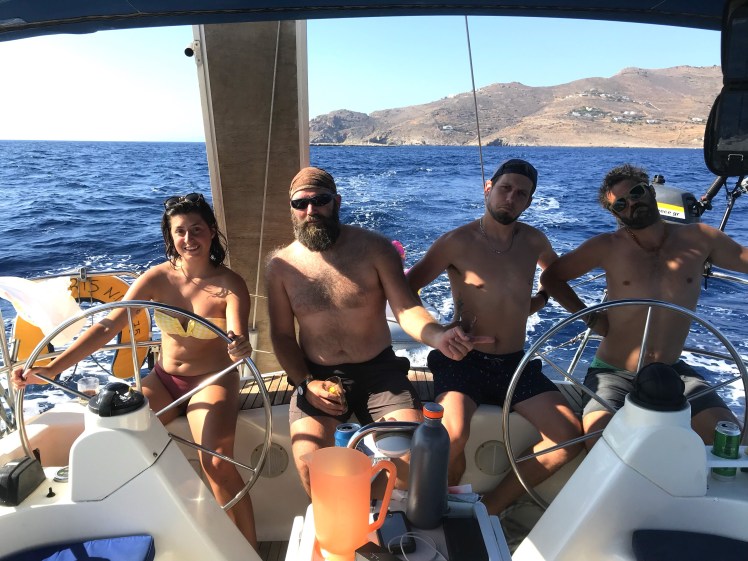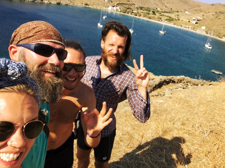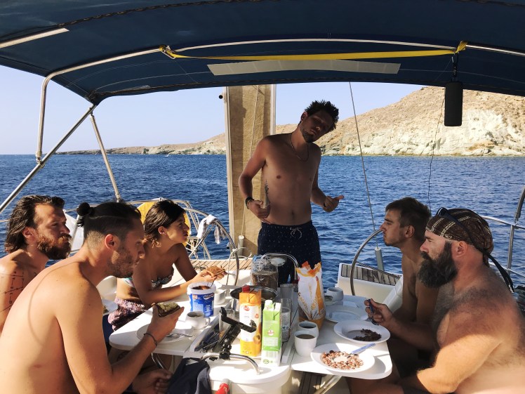 It was here that the first crew rotation would be departing, and the second would pick up, with the captains and the second crew returning to Athens over the course of the next two weeks. So, we spent the day with the second crew as well, and had a big dinner at a beachside restaurant in the port with everybody, celebrating the birthday of one of the captains as well.